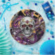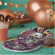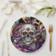 Día de Muertos ou pratos de papel em preto, roxo, ouro com crânio de açúcar.