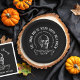 Chapas de papel do Halloween impressas personalizadas para corresponder à nossa coleção Vintage Skull. Personalize-o com seu nome de família, detalhes da festa ou outro texto personalizado em torno de uma ilustração do crânio de safra angustiada e o ornamento de rolagem em um fundo preto. Use as ferramentas de design para editar as fontes de texto e as cores e adicionar suas próprias fotos e texto para criar seu próprio decor de festa do Dia das Bruxas.
