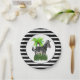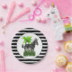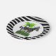 Este prato de papel de zebra irá combinar com uma festa temática de selva. O prato apresenta um fundo listrado preto e branco com uma ilustração de zebra e palmeira no centro com fundo branco.