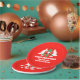 Chapas de papel elegantes para a festa de férias do seu escritório, com uma moderna aquarela de pinheiros em verde-mudo, vermelho, "Feliz Natal" em uma escrita de chic e seu nome comercial em uma simples tipografia.