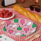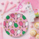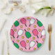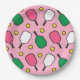 Pratos criativos para festa ou evento de pickleball com remos cor-de-rosa quente e verde fresco e padrão de bolas amarelas em fundo rosa para os seus jogadores de pickleball favoritos.
