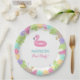 Folhetos tropicais e flores, com frutas e um flamingo fofo flutuante para a festa perfeita de piscina das meninas!