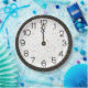 Relógio com meia-noite em um fundo branco com borda negra e confete colorido caindo para a festa de Ano Novo.