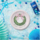 Este design tem uma coroa de madeira de boxe com um arco de gingham rosa. Abaixo, em texto verde curvo, lê-se "Feliz Natal".