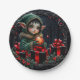 Filha de Elfo Bela em Casaco verde com Enfeites de natal - Design de Férias de Fantasia Mágica. Uma criança bonita de elfo com olhos grandes e ouvidos pontiagudos veste um casaco de capuz verde aparado e segura um Enfeites de natal laranja brilhante. Cercado por caixas de presentes com fitas vermelhas, ramos de pinheiros e bagas, esta cena mágica de feriado parece festiva e mística. A sombria estrutura de ornamentado com vista para uma floresta encantada torna este design perfeito para amantes da fantasia, fãs de Natal e arte mágica de férias.