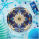 Um padrão floral simétrico apresenta-se de forma destacada, com pétalas brancas esboçadas em ouro contra fundo azul profundo e azul claro. O design irradia elegância e complexidade, criando um motivo visualmente impressionante.