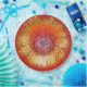 Um belo abstrato de mosaico de girassol de verão com um fundo vermelho laranja.