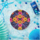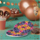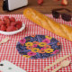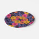 Essas placas de papel apresentam flores e folhas em tons saturados de amarelo, laranja, roxo e rosa quente cercados de contornos vermelhos.
