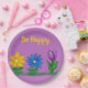Flores de jardim ensolaradas contra fundo violeta. Girassol amarelo, margarida amarela azul, tulipa roxa florida na grama verde. Be Happy é escrito em tipografia amarela. Deixe o texto como está, personalize ou exclua a caixa de texto. Adorável para o primavera ou meses de verão ou qualquer hora do ano trazer o dentro para o exterior. Arte original de TamiraZDesign.