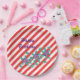 Bonito, divertido e moderno - flores e listras, em placas de papel. As listras vermelhas e brancas fazem um padrão diagonal com flores roxas e folhas verdes em camadas em cima. Feliz Aniversário é escrito em letras de script em roxo. O texto também pode ser facilmente personalizado na forma modelo para qualquer outra ocasião. Obrigado por comprar em CherylsArt no Zazzle.