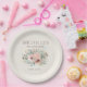 Chapas de papel de festa de aniversário elegantes e personalizadas. Decorados com lindas flores cor-de-água rosa e cor-de-rosa e folhas verdes cinzentas sobre um fundo brilhante de ouro brilhante. Personalizada com o nome da convidada de honra e a data do seu partido. Entre em contato comigo para obter assistência com a personalização ou para solicitar a correspondência ou a coordenação de produtos Zazzle para o seu partido.