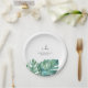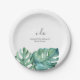 Melhore seu chá de panela com essas elegantes placas descartáveis, com folhas tropicais de palma monstera. Personalize-os sem esforço usando os campos de modelo fornecidos para adicionar seu texto personalizado. Peça em pequenas quantidades ou granéis para o seu casamento ou chá de panela. Conheça mais tableware decorativo como este em www.zazzle.com/dotellabelle. Cada placa mostra uma única arte aquosa e design por Victoria Grigaliunas do Do Tell A Belle. Para a papelaria de casamento, me mande ver os detalhes.