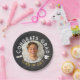 Chapas de papel para uma festa de formatura personalizada com a dentro de formando, um modelo de círculo escovado com o formando Congrats, e o ano em uma fonte curvada, inspirada no giz, à volta da foto e um diploma e boné de formatura contra um fundo de quadro impresso.
