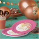 O tronco de Freesia Rosa Quente é impermeável em uma lavagem solar tropical de textura. A tipografia graciosa personaliza-se elegantemente com as iniciais do casal e a data do casamento.