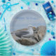 Estas placas de papel caracterizam uma gaivota relaxed que descansa na ameia de um pedregulho na praia de Hammonasset em Madison, Connecticut.