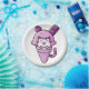 Um gato feliz em um cone de sorvete com o sorvete na cabeça, o sorvete é de cor de morango e há um floco de chocolate saindo do sorvete. Por martinspixs.