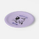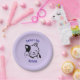 Um prato de papel de aniversário personalizado desenhado com a ilustração de um gatinho sorridente e balançando com um ponto preto ao redor do seu ouvido. Fundo roxo. Simples e adorável.