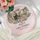 Uma colagem de doces animais selvagens safari da selva — girafa, zebra, pântano, tigre e elefante — é acolhida acolhidamente entre o hibisco tropical e a vegetação monstera neste design de Baby Sprinkle. Fundo é uma cor d'água rosa gradiente. Design composto por Designs Holiday Hearts.