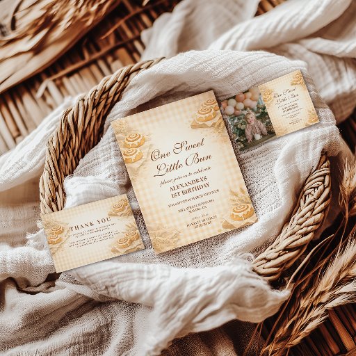 Celebrate a cozy first birthday with this warm cinnamon roll–inspired design featuring soft bakery details, rustic textures, and a gentle neutral palette. Perfect for a “little bun” or bakery-themed party, this invitation sets a sweet, welcoming tone for a memorable first birthday. Fully editable to personalize names, dates, and party details.
