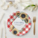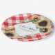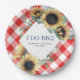 Pratos de papel personalizados rústicos para o seu chá de casal, chá de noiva, chá de casamento country ou Eu Aceito Churrasco apresentam uma borda xadrez com girassóis em aquarela e folhagens em um padrão xadrez vermelho. Personalize com seus nomes e data. Para ver mais designs de impressão xadrez como este visite www.zazzle.com/vginvites