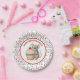 A cute girl's birthday birthday personalized paper plates with a sweet mouse and cupcake theme. Pink, beige and cherry red sprinkles on a cute vanilla cupcake being held by a watercolor mouse!
