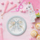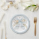 Pretty and feminine, this custom paper plate is designed to celebrate a girl's First Holy Communion. The design features a pastel dusty blue watercolor bow with ivory white flowers with a soft dusty blue border. A lovely silver cross sits above the bow as a symbol of Christianity. Easy to personalize and prepare for this momentous occasion in the life of your daughter. This paper plate design is available in 2 sizes; shown here in the smaller 7-inch diameter size, they are also available in a larger 9-inch diameter size.