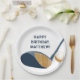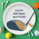 Create golfing themed party supplies for birthday parties and more. These paper plates feature my realistic style illustration of a golf club and golf ball in shades of blue and gold and are ready to be personalized with your own custom message in matching navy blue lettering.