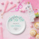 Apresentando gotas de chuva verdes de menta giras caindo em direção aos detalhes personalizados sobre este chá de fraldas neutro de gênero, borrifa ou placa de papel do chá de casais. Projetado por Thisnotme©