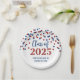 Classe de festa de formatura personalizável de 2025 pratos em um padrão de confete vermelho e azul glamouroso e texto elegante com letra manual.