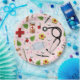 Placas criativas de festas de formatura de enfermagem para celebração de formando de enfermagem com suprimentos de saúde e flores em fundo rosa.
