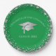 This modern design features a graduation hat and confetti in silver on a background of green with white text.