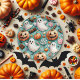 Fantasmas de Halloween, jack-o-lanternas, morcegos e doces sobre fundo de chá.