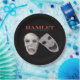 Para lustres do teatro. O título das mostras do Hamlet de Shakespeare em vermelho brilhante e é embaixo máscaras da comédia. Atrás de uma máscara estão sorrindo os dentes e uns únicos olhos azuis.