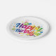 A bright and cheerful “Happy Birthday” plate bursting with color and celebration. The bold rainbow‑gradient lettering takes center stage, surrounded by playful balloons, stars, and swirling streamers in vibrant reds, blues, yellows, and greens. The crisp white background keeps everything clean and festive, making it an easy match for any party theme. Perfect for birthdays of all ages and a fun way to add instant joy to the table.
