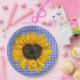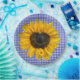 Girassol amarelo com centro em forma de coração e joaninha em gingham azul e branco.