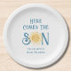 These baby shower paper plates feature the text "Here Comes The Son" in blue retro typography with a cute yellow watercolor sun.