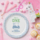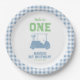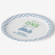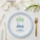 First birthday golf theme "Hole in One " with gold cart and light blue checkered plaid pattern.