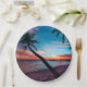 Pise nesta praia tropical da ilha do paraíso! Esta foto tropical bonita caracteriza um Sandy Beach, umas palmeiras, um mar infinito, e lindo e vibrante um por do sol cénico colorido uma laranja em uma ilha tropical do paraíso. O mar tropical reflete a luz de céu em matiz notáveis de azul, de alaranjado, e o roxo.