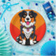 A ilustração encantadora do rosto alegre de um cão centrado sobre um fundo laranja ousado, mostrando cores vibrantes e um estilo divertido e de desenho animado.