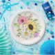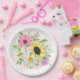 Este prato de papel é mostrado em uma cor branca com uma encantadora impressão floral.