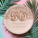 A metade superior desta design cinzenta, cinzenta, apresenta um padrão de manchas-leopardo douradas rosa cintilantes num fundo rosado, com "50" em grandes números de balões rosa de ouro. Adicione o nome do convidado de honra em um elegante roteiro de escrita manual de rosa escura em fundo azul, com as palavras "50ª festa de aniversário em fonte sans serif abaixo.