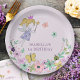 Chapas de papel tematizadas de Fada Mágica Cuta que você pode personalizar para qualquer ocasião. A design apresenta uma fada mágica, borboletas, pássaros-panela e flores de jardim caprichosos. Doce design de areia em tons pastéis de verde-rosa lilás e amarelo.