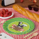 Esta placa da festa de aniversário caracteriza uma jaritataca preto e branco do clipart bonito que senta-se em um coto de árvore cercado por três vermelhos e pelos cogumelos brancos. O fundo da placa é verde no centro com as listras verdes de coordenação do dois-tom na borda da placa do partido.