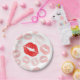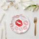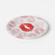 Esta placa de papel divertida apresenta vários impressões de batom vermelho em um fundo branco.