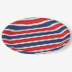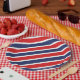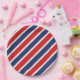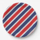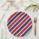 Prato de papel para festa é mostrado em uma estampa de listras vermelhas, brancas e azuis patrióticas.