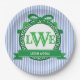 Este prato de papel elegante apresenta um fundo listrado atemporal em azul e branco, reminiscente de designs clássicos costeiros e preppy. Um monograma personalizado é lindamente enquadrado dentro de uma borda de chave grega e adornado com um charmoso laço verde. Ideal para festas temáticas náuticas, reuniões de verão, celebrações ao estilo sulista ou brunch preppy, este prato estiloso adiciona um toque sofisticado a qualquer evento.