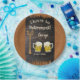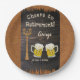 Estas elegantes e divertidas placas de papel apresentam duas canecas de cerveja e uma lâmpada postada em uma madeira de borda decoada e padrões de couro.