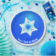 Apresenta uma estrela fractal branca de David num fundo azul. Adicione seu próprio texto.