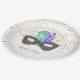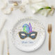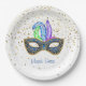 Esta placa de papel é mostrada em branco com estrelas douradas com uma festiva impressão de máscara de carnaval Mardi Gras. Também oferecemos um guardanapo de papel equivalente. Personalize este item ou comprar como está.