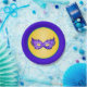 Máscara de brilho púrpura de Mardi Gras em um fundo amarelo com uma borda roxa e verde.